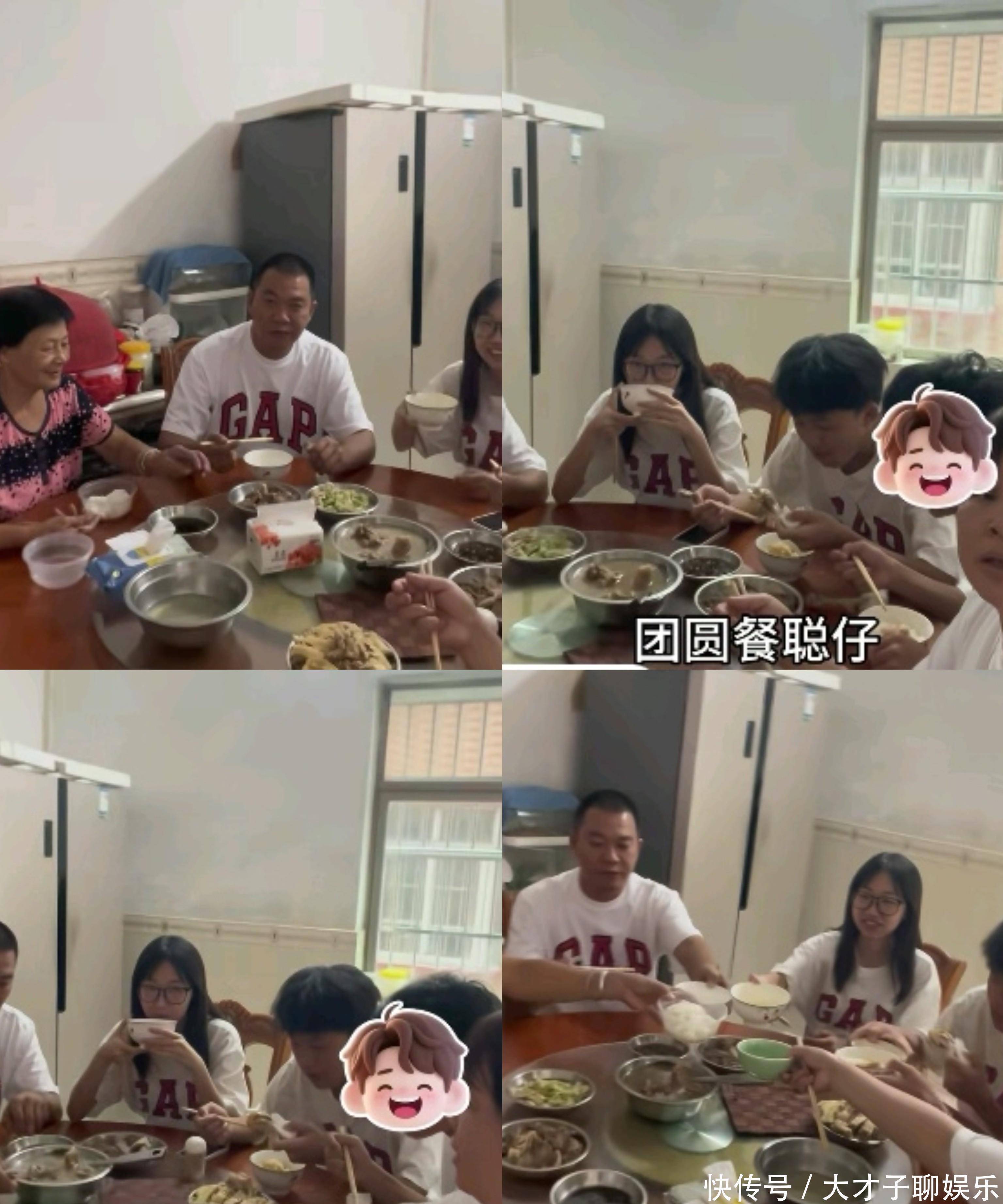 在出发前一天,叶锐聪一家六口人坐在一起吃了团圆饭,奶奶脸上终于露出了幸福的笑容,看着大孙子不停的干饭,满脸欣慰,就想让大孙子多吃点,快点长胖。
